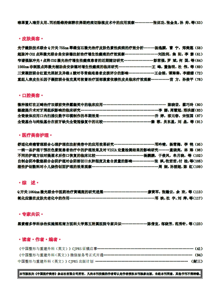 《中國醫(yī)療美容》2020年第8期即將出刊。本期【特約來稿】關注光電技術如何服務皮膚美容,這是醫(yī)學與市場高度結合的領域,發(fā)展迅速;無論臨床醫(yī)生、患者、抑或是設備廠家,需要及時總結光電技術解決皮膚美容問題的臨床經驗及相關研究,如此才能推動技術與方法不斷向前。歡迎閱讀《激光治療增生性瘢痕的研究進展》(華中科技大學同濟醫(yī)學院附屬協(xié)和醫(yī)院李小丹教授團隊聯(lián)合武漢大學附屬中南醫(yī)院謝君博士)及《光聲電技術在嫩膚除皺領域的臨床應用與進展》(河南省人民醫(yī)院皮膚科李雪莉主任團隊)。