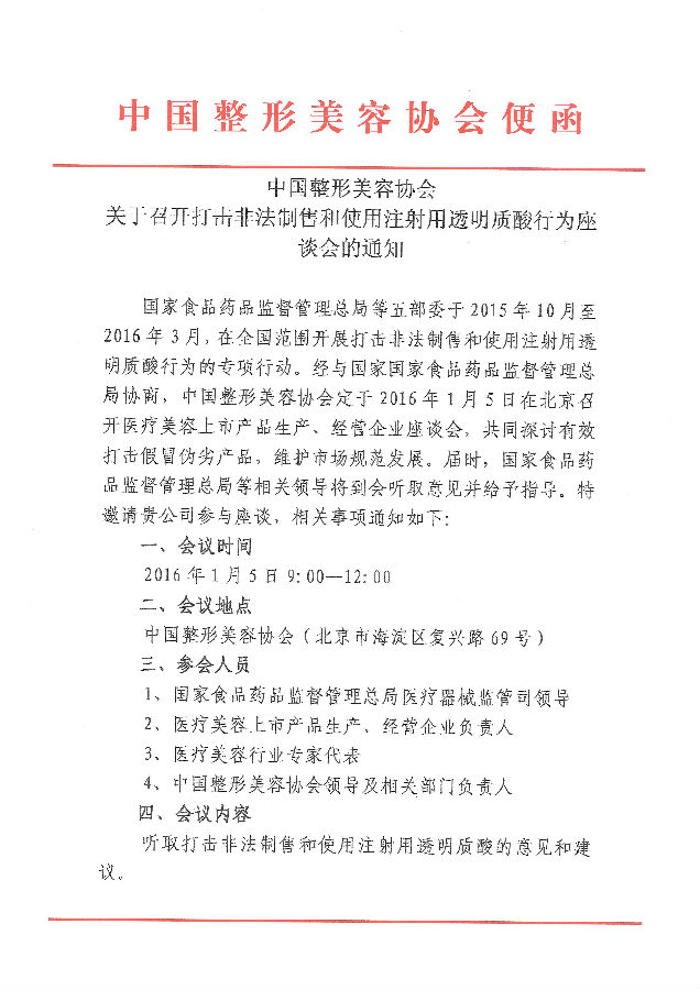 中國(guó)整形美容協(xié)會(huì)關(guān)于召開(kāi)打擊非法制售和使用注射用透明質(zhì)酸行為座談會(huì)的通知
