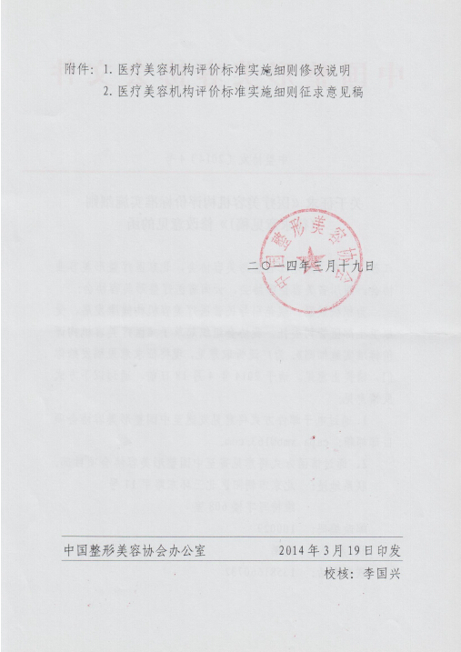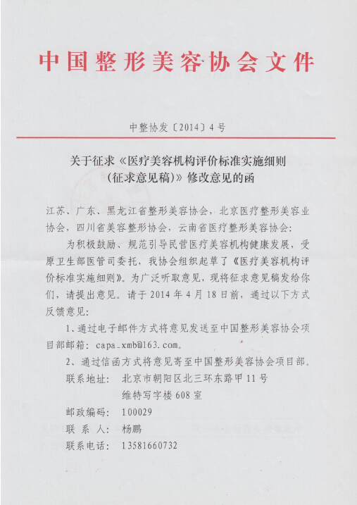【中整協(xié)發(fā)[2014]4號】《關(guān)于征求《醫(yī)療美容機構(gòu)評價標準實施細則》修改意見的函》.