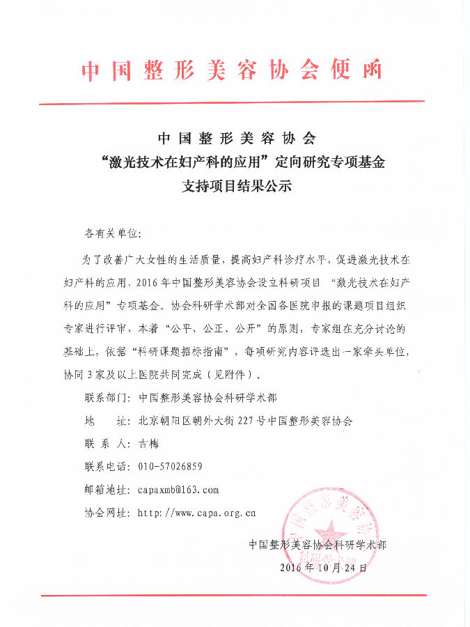 為了改善廣大女性的生活質(zhì)量,提高婦產(chǎn)科診療水平,促進(jìn)激光技術(shù)在婦產(chǎn)科的應(yīng)用,2016年中國整形美容協(xié)會(huì)設(shè)立科研項(xiàng)目 “激光技術(shù)在婦產(chǎn)科的應(yīng)用”專項(xiàng)基金,具體事宜請(qǐng)參見2016年科研課題招標(biāo)指南。